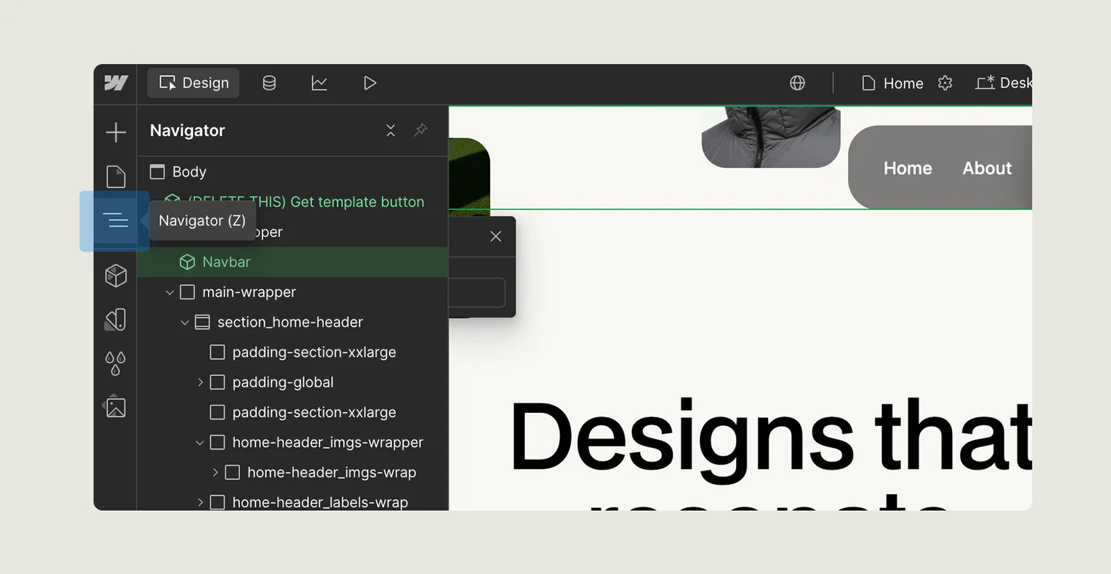 To see and manage all the elements on a page, use the Navigator panel — it’s the icon with stacked layers on the left side of the Webflow Designer. The Navigator shows the full structure of your page in a hierarchy (like folders). This is especially helpful when: